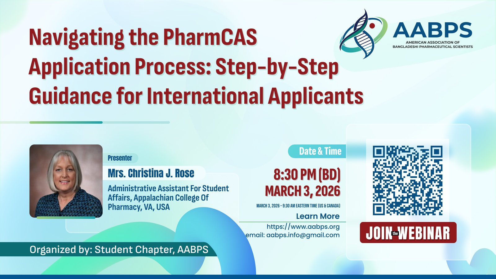 The American Association of Bangladeshi Pharmaceutical Scientists (AABPS) successfully hosted an informative webinar titled “Navigating the PharmCAS Application Process: Step-by-Step Guidance for International Applicants.” The session was designed to guide international students—particularly those from Bangladesh—through the process of applying to PharmD programs in the United States.